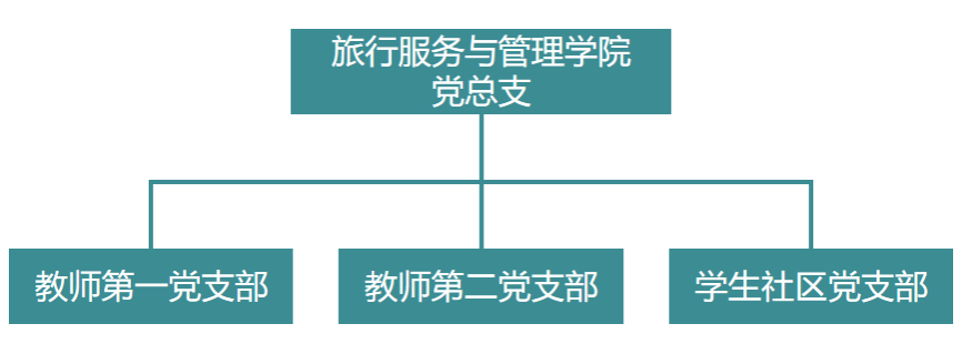 旅行服务与管理学院于2002年设立党支部,2003年扩大支部建制,成立旅行服务与管理学院(原旅行社管理系)党总支。目前,学院党总支已完成新一轮基层党组织换届选举,下设3个党支部:教师第一党支部、教师第二党支部和学生社区党支部。党总支现有教师党员55名,学生党员21名。组织结构如下图: